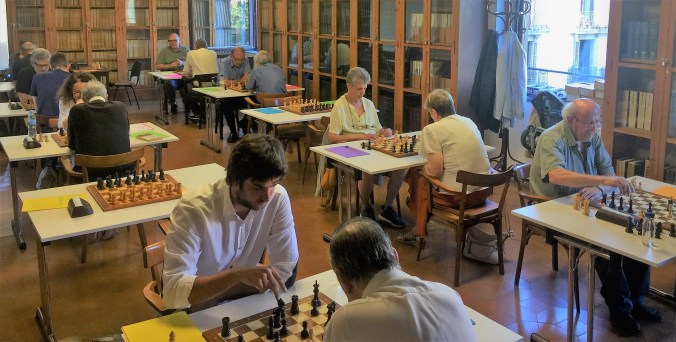 Us voldria donar un munt de dades, però encara només han publicat els resultats per equips i cap per jugadors. Malgrat tot us faré cinc cèntims. Carles Molina va fer una actuació meritòria dins el B. Jugava de quart tauler i va fer un munt de punts –encara no els sé perquè, com ja he dit, no els han publicat i jo no els vaig apuntar- si no vaig errat, quatre o cinc, molt bé. Toni Pampalona va aguantar, també dins el B, la pressió de ser el primer tauler. Juli Bernat, al matí de segon i a la tarda de tercer, va fer menys que no pas esperava –dos i mig. Jordi B. Oliva, segon del B a la tarda, va demostrar una gran concentració, sempre arribava primer a la taula que ens tocava. Jordi Calvet, tercer del B al matí, va jugar amb l’energia i passió que el caracteritza, pura passió tranquil·la: jo, a la vuitantena, vull jugar com ell! El Jordi Calvet és un exemple de dedicació i ímpetu que donaria per fer un anunci impactant. “Vine a l’Ateneu Barcelonès i gaudiràs de…”. I de l’equip A, què us puc dir? Ben poc, no els vaig veure gairebé mai jugar! Arribava gairebé sempre quan havien acabat o només quedava un tauler viu. Que em disculpin els companys. Només puc dir que els vaig veure sempre acompanyats de la millor bonhomia.
