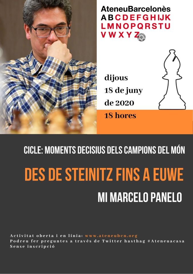 El passat 18 de juny de 2020 el mestre internacional Marcelo Panelo va impartir la conferència: Moments decisius dels campions del món: des de Steinitz fins a Euwe. Anècdotes, històries i partides decisives.